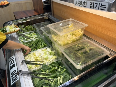 돼지나 소갈비를 1인 1메뉴로 시키면 야채샤브샤브와 수제비, 칼국수, 간장게장, 셀프바가 무료다!!